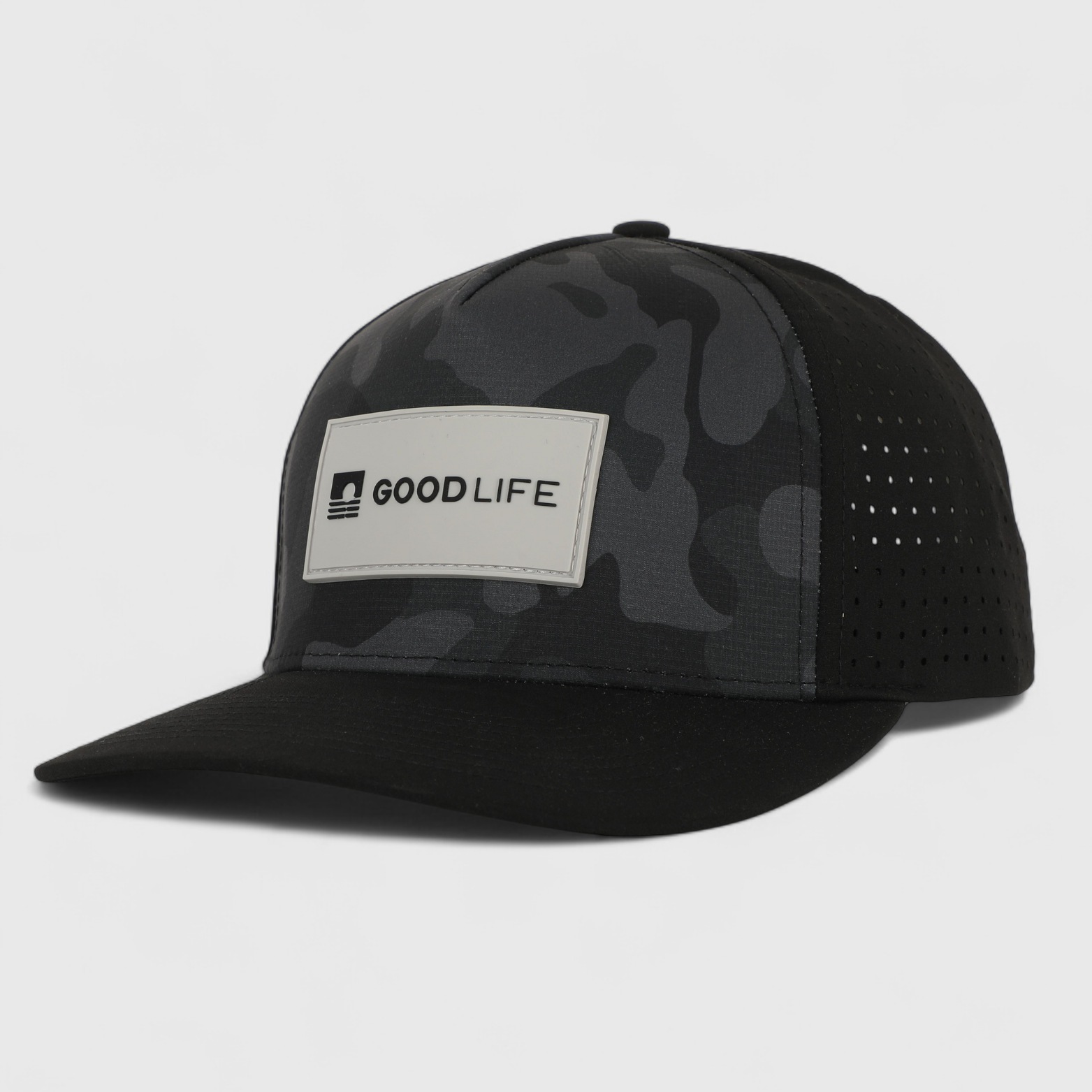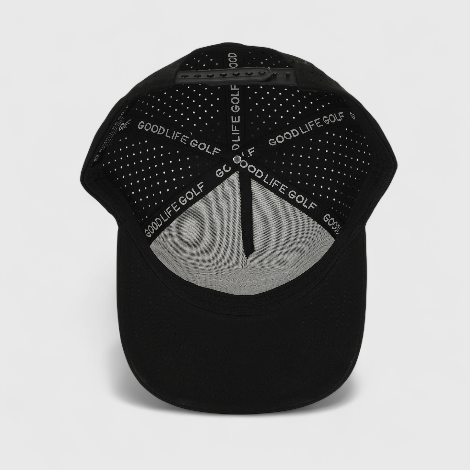 Precision-engineered for peak performance and all-day wearability, this snapback blends technical function with elevated style. Constructed from a lightweight, stretch-infused polyester/spandex blend and treated with a water-resistant coating, it delivers breathable comfort and moisture control under pressure. Thoughtful details—like the custom interior GOOD LIFE lining, sweat-wicking band, and our signature PVC patch —bring a sophisticated edge to a course-ready essential.